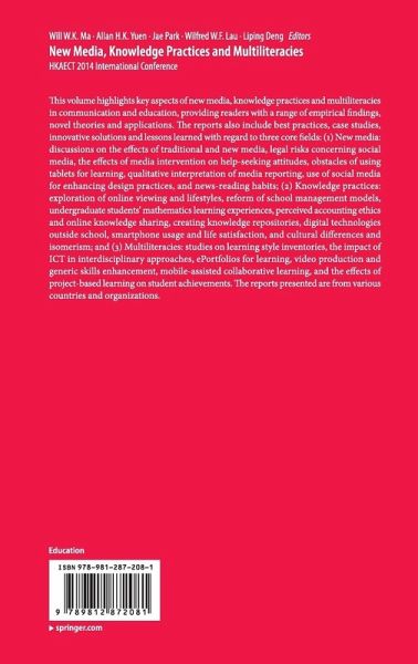 Introduction.- The Changing Face of Educational Technology: New Media, Knowledge Practices and Multiliteracies Allan H.K. Yuen.- New Media.- Cultivation Effects of Television Broadcasting and Online Media Hey Yeung Lau.- Online Legal Risks in Social Media: Lessons from a Few Court Cases in Hong Kong Kar-wai Tong.- The Effect of a Brief Media Intervention on Help-Seeking Attitudes among College Students in Hong Kong Wai Kit Wong.- Understanding the Obstacles of Using Tablet as a Learning Tool in Primary Schools from Teachers' Perceptions Xiaolei Li, Allan H.K. Yuen, Wenting Zou.- "Whistleblower or Leaker?" Examining the Portrayal and Characterization of Edward Snowden in US, UK and HK Posts Amy Wu, Will W.K. Ma, Wendy W.L. Chan.- Destuckification": Use of Social Media for Enhancing Design Practices Yun Yi Tan, Allan H.K. Yuen.- News Reading Habits of Young University Students in Hong Kong in the Age of New Media Alvin C.M. Kwan, Ivy C.T. Cheng, Joie H.Y. Wong.- Knowledge Practices.- An Exploration of Online Viewing on an Individual's Dating Attitude and Love Style Hilda Yuet Hang Kho.- The Restriction of Degree: Reform of Public School management models Kongzhen Li, Jingjing Zhang.- Falling through the Cracks: Undergraduate Students' Mathematics Learning Experience Lesa Covington Clarkson, Forster D Ntow, Sousada Chidthachack, Elizabeth A Crotty.- An Exploratory Study on Interactive Whiteboard Usage on Enhancing Oral English in Secondary Classrooms Guochen Zhang, Liping Deng.- Exploring Perceived Accounting Ethics of University Students on Online Knowledge Sharing Sally M. Li .- Exploring Hong Kong Youth's Engagement with Digital Technologies outside School Liping Deng, Jan Connelly, Miki Lau, Kelly Y.L. Ku.- Building up a Knowledge Repository in a School Kai Wing Chu.- Smartphone Usage, Social Relations and Life Satisfaction of Hong Kong CollegeStudents Raymond Chi Fai Chui.- Concept of Cultural Differences between Chinese and Western University Culture Based on the Idea of Isomerism Cheng-en Li, Tie-shan Hou, Liang Chang .- Exploring the Effectiveness of Blended Learning in Cost and Management Accounting - An Empirical Study Rosanne Suet Ching Chak, Heidi Fung.- Multiliteracies.- Variable-centered and Person-centered Approaches to Studying the VARK Learning Style Inventory Wilfred W.F. Lau, Allan H.K. Yuen, Albert Chan.- The Impact of ICT on Pedagogical Practices in an Interdisciplinary Approach Kathryn Reed.- Students' Perception of Using ePortfolios for Learning in Higher Education Danlin Yang, Alexandra Chiu Yee Ngai, Hing Keung Hung .- Investigating the Relationship between Students' Attitude towards Video Production Project and their Generic Skills Enhancement Heidi Fung, Will W.K. Ma.- Enhancing Primary School Students' Story-Writing by Mobile-Assisted Collaborative Learning: A Case Study Wenting Zou, Xiaolei Li .- The Impact of Project-Based Learning and Technology on Student Achievement in Mathematics Leah J Branch.
