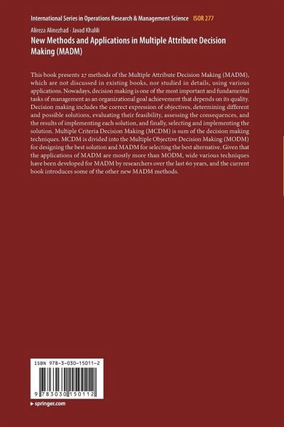This book presents 27 methods of the Multiple Attribute Decision Making (MADM), which are not discussed in the existing books, nor studied in details, using more applications. Nowadays, decision making is one of the most important and fundamental tasks of management as an organizational goal achievement that depends on its quality. Decision making includes the correct expression of objectives, determining different and possible solutions, evaluating their feasibility, assessing the consequences, and the results of implementing each solution, and finally, selecting and implementing the solution. Multiple Criteria Decision Making (MCDM) is sum of the decision making techniques. MCDM is divided into the Multiple Objective Decision Making (MODM) for designing the best solution and MADM for selecting the best alternative. Given that the applications of MADM are mostly more than MODM, wide various techniques have been developed for MADM by researchers over the last 60 years, and the currentbook introduces some of the other new MADM methods.