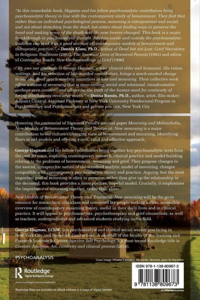 "We owe our gratitude to George Hagman, a wise clinical elder and humanist. His vision, writings, and his selection of like-minded contributors, brings a much-needed change to our old, dead psychoanalytic narratives of loss and mourning. Their collective work offers a vision of mourning that is open-ending, social and relational, transformative perhaps even creative, and allows for the truth of the human need for continuity of loving attachments even after death."-Donna Bassin, Ph.D. Author, artist, film-maker. Adjunct Clinical Assistant Professor at New York University Postdoctoral Program in Psychotherapy and Psychoanalysis and private practice, New York City.