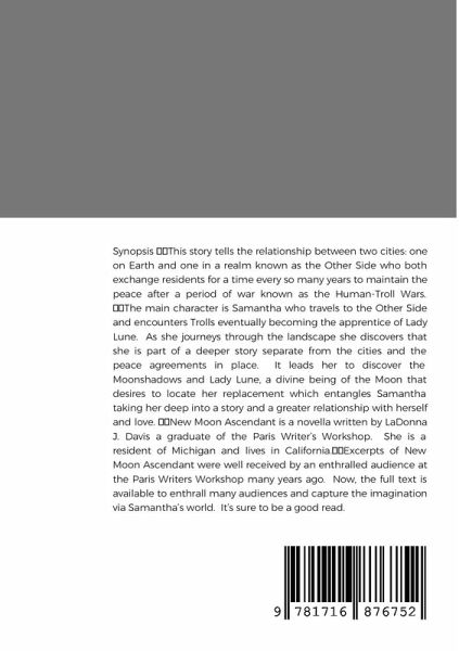 This story tells the relationship between two cities: one on Earth and one in a realm known as the Other Side who both exchange residents for a time every so many years to maintain the peace after a period of war known as the Human-Troll Wars. The main character is Samantha who travels to the Other Side and encounters Trolls eventually becoming the apprentice of Lady Lune. As she journeys through the landscape she discovers that she is part of a deeper story separate from the cities and the peace agreements in place. It leads her to discover the Moonshadows and Lady Lune, a divine being of the Moon that desires to locate her replacement which entangles Samantha taking her deep into a story and a greater relationship with herself and love. It's available via Lulu, Kobo, Barnes & Noble and Amazon online. New Moon Ascendant is a novella written by LaDonna J. Davis a graduate of the Paris Writer's Workshop. She is a resident of Michigan and lives in California. Excerpts of New Moon Ascendant were well received by an enthralled audience at the Paris Writers Workshop many years ago. Now, the full text is available to enthrall many audiences and capture the imagination via Samantha's world. It's sure to be a good read.