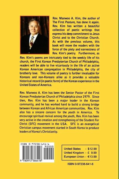 NEW MORNING OF THE PASTURE: POETIC REFLECTIONS OF A KOREAN AMERICAN PASTOR is by Rev. Manwoo A. Kim of The First Korean Presbyterian Church of Philadelphia. Rev. Kim is one of the most senior Korean pastors in the Greater Philadelphia area and is a living testimony of the history of the Korean churches in the area. Rev. Kim has served as the chairman of the Pan-Korean Churches Council in Philadelphia, an ecumenical council whose membership includes nearly 100 per cent of the Korean Christian churches in the area. Currently, the Rev. Kim serves as one of the board members of the National Missionary Council of Korean Churches, which includes membership of nearly all the Korean Christian churches in the North America across denominational lines. Rev. Kim brings his experiences and insights to bear in his poetry. He explores Biblical ideas, themes relating to Christian life and holiness, and the life of his church congregation, which he has served as the Senior Pastor since 1979. Rev. Kim's poems will encourage you in your Christian walk and give you a glimpse of the experiences of Korean American Christian brothers and sisters. By reading this book, you will come to understand why Christianity is so vibrant in Korea and among Koreans in the USA. Included in the book is his important essay on missions, entitled, "The Korean Diaspora's Realized Vision."