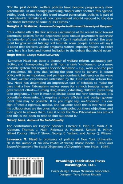 " If government tells dependent people how to live today, will we have a more self-reliant society tomorrow? That's the critical question as government increasingly seeks to supervise the lives of poor citizens who are dependent on it, often in return for supporting them. This trend is most visible in welfare policy, where ""welfare reform"" largely means attempts to require adults receiving assistance to work or stay in school in return for aid. However, it can also be seen in policy toward the homeless, where shelters increasingly set rules for their residents; in education, where states have instituted tougher standards for children; and in drug programs that test addicts for compliance. The drift in antipoverty policy is toward paternalism-the close supervision of the dependent. Paternalism has been a major trend in social policy for the past decade, and it has support from the public. But it has received little attention from researchers and policy analysts-until now. The New Paternalism opens up a serious discussion of supervisory methods in antipoverty policy. The book assembles noted policy experts to examine whether programs that set standards for their clients and supervise them closely are better able to help them than traditional programs that leave clients free to live as they please. Separate chapters discuss programs to promote work in welfare, prevent teen pregnancy, improve fathers' payment of child support, shelter homeless men in New York City, deter drug addiction, and improve the education of the disadvantaged. Cross-cutting chapters address the management of paternalism, the psychological needs of poor adults, and the tension between paternalism and American politics. The authors consider both sides of the debate over this controversial issue. Several chapters address the sensitive question of whether government or private organizations are best able to implement supervisory programs. The conclusions are optimistic"