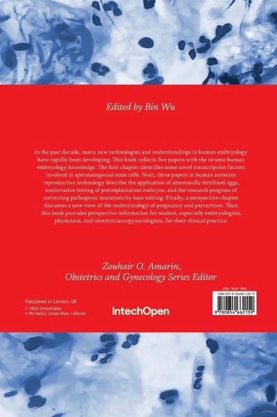 In the past decade, many new technologies and understandings in human embryology have rapidly been developing. This book collects five papers with the newest human embryology knowledge. The first chapter identifies some novel transcription factors involved in spermatogonial stem cells. Next, three papers in human assistant reproductive technology describe the application of abnormally fertilized eggs, noninvasive testing of preimplantation embryos, and the research progress of correcting pathogenic mutations by base editing. Finally, a perspective chapter discusses a new view of the endocrinology of pregnancy and parturition. Thus, this book provides perspective information for readers, especially embryologists, physicians, and obstetricians/gynecologists, for their clinical practice.