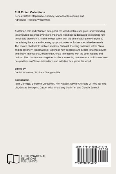 As China's role and influence throughout the world continues to grow, understanding this evolution becomes ever more important. This book is dedicated to exploring new trends and themes in Chinese foreign policy, with the aim of adding new insights to the existing literature and opening up opportunities for further specialised research. The book is divided into to three sections: National, touching on issues within China and its periphery; Transnational, looking at how concepts and people influence power; and finally, International, examining China's interactions with the other regions and nations. The chapters work together to offer a sweeping overview of a multitude of new perspectives on China's interactions and activities throughout the world. Contributors Ilaria Carrozza, Benjamin Creutzfeldt, Nori Katagiri, Neville Chi Hang Li, Tony Tai-Ting Liu, Gustav Sundqvist, Casper Wits, Shu Liang (Karl) Yan and Claudia Zanardi