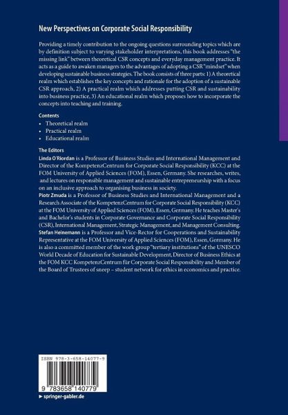 Linda O¿Riordan is a Professor of Business Studies and International Management and Director of the KompetenzCentrum for Corporate Social Responsibility (KCC) at the FOM University of Applied Sciences in Germany. She researches, writes and lectures on responsible management and sustainable entrepreneurship with a focus on an inclusive approach to organising business in society. Her work has been published in internationally renowned peer-reviewed journals such as the Journal of Business Ethics. In her educational role, Linda O¿Riordan lectures mainly to MBA and also Bachelor students in the subjects: Business Strategy, Corporate Governance and CSR, International Management, Management Consulting and Problem-Solving, Intercultural Competence, as well as Marketing, Sales and Customer Relationship Management. Additionally, she is a guest lecturer at various Universities including the University of Applied Sciences (Fachhochschule) and Heinrich-Heine University in Düsseldorf. Linda O¿Riordan is a general manager by background with a PhD from the University of Bradford in the UK. Previous to her academic role, she gained business and consultancy experience from working in industry. Some of her former employers include Accenture, UCB-Schwarz Pharma, and the Government of Ireland (Bord Bia) marketing Irish food and drinks products in Northern Europe, as well as apprenticeship positions during her studies in Ireland at the Irish Telecom Company, Dublin (now Eircom), and the Bank of Ireland, Cork. Her qualifications include a Bachelor¿s degree in Business Studies from the University of Limerick, Ireland, as well as an MBA and a Masters in Research from the University of Bradford in the UK.Piotr Zmuda is a Professor of Business Studies and International Management and a Research Associate of the KompetenzCentrum for Corporate Social Responsibility (KCC) at the FOM University of Applied Sciences (FOM) in Germany. He teaches Master's and Bachelor's students in Corporate Governance and Corporate Social Responsibility (CSR), International Management, Strategic Management, and Management Consulting. His research interests focus on the analysis and development of strategies based on the resource and market-based view as well as the formulation and implementation of internationalisation strategies. Piotr Zmuda studied Business Administration at the University of Cologne and received his doctoral degree at the Heinrich-Heine-University, Düsseldorf. He was appointed as a Professor of International Business and Management Consulting at the Cologne Business School (CBS) in 2010. He further participated as a Visiting Professor in the Sustainability MBA program at the Duquesne University School of Business, Pittsburgh, PA, USA. Piotr Zmuda gained his first practical experience as a management consultant while working for an international consulting company specialised in delivering consulting services in the financial services sector. He has assisted a large number of well-known Financial Service Companies in the efficient execution of projects and optimisation of their in-house processes. After leaving this sector, he switched to the role of in-house consultant for a multinational industrial company. Piotr Zmuda is a certified Project Manager (PRINCE2) and a member of the Academy of Management (AoM).Prof. Dr. Stefan Heinemann is Vice-Rector for Cooperations and Sustainability Representative at the FOM University of Applied Sciences (Germany). In addition, he is the director of the FOM Open Business School and the Representative of the Foundation BildungsCentrum der Wirtschaft within the zdi-Zentrum MINT-Netzwerk Essen. He is also a committed Member of the workgroup "tertiary institutions" of the UNESCO World Decade of Education for Sustainable Development, Director Business Ethics at the FOM KCC KompetenzCentrum für Corporate Social Responsibility and Member of the Board of Trustees of sneep - student network for ethics in economics and practice. Furthermore, he is Co-Director within the FOM KCP KompetenzCentrum für Public Management and Member of several research boards. He is also a Member of the Strategy Board of the BDA/BDI-Bundesinitiative "MINT Zukunft schaffen", board Member of the Kölner Wissenschaftsrunde and Member of the scientific board of the HKR NRW Hochschulkompetenzzentrums Rechnungswesen at the University of Duisburg-Essen. Stefan Heinemann's teaching and research is focused on Business Ethics and Public Management/University Management (Finance and Strategy).