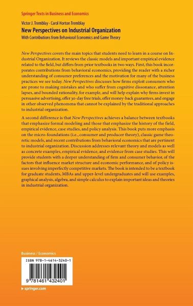 A second difference is that this book achieves a balance between textbooks that emphasize formal modeling and those that emphasize the history of the field, empirical evidence, case studies, and policy analysis. This text puts more emphasis on the micro-foundations (i.e., consumer and producer theory), classic game theoretic models, and recent contributions from behavioral economics that are pertinent to industrial organization. Each topic will begin with a discussion of relevant theory and models and will also include a discussion of concrete examples, empirical evidence, and evidence from case studies. This will provide students with a deeper understanding of firm and consumer behavior, of the factors that influence market structure and economic performance, and of policy issues involving imperfectly competitive markets. The book is intended to be a textbook for graduate students, MBAs and upper-level undergraduates and will use examples, graphical analysis, algebra, and simple calculus to explain important ideas and theories in industrialorganization.
