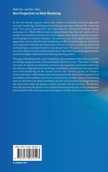 This groundbreaking book, moves along three representations of developed scientific knowledge: imaginary lines, circles and spirals. The first section, "The Lines", develops new lines of inquiry on attention (selective and sustained) and mind-wandering, the influence of age and mind-wandering, embodiment, consciousness and experience and mind-wandering. In the second section, the "Circles", groups of Chapters on the same topic, methodology (tasks and measurement), intervention (auditory beat stimulation and mindfulness practices) and creativity, recreate a dance of interacting parts in which there are always profitable, decisive and retroactive exchanges between the information that each group or author activates. The last section, "The Spirals", critically discusses the absence of a unified theoretical perspective, in the pedagogical field, attentive both to the processes of emergence and the interactions between parts.