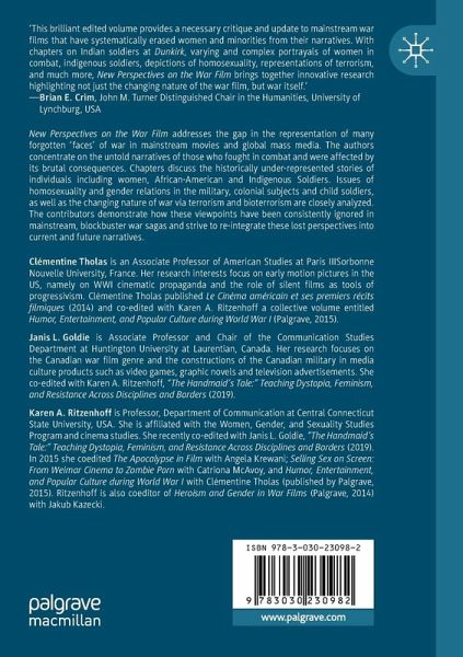 Foreword; Robert Burgoyne..- Introduction; Clémentine Tholas-Disset, Janis Goldie, and Karen A. Ritzenhoff.- 1.Women and Nation in Films of the Great War; Thomas J. Saunders.- 2. Vamps and Virgins: The Women of 1920s Hollywood War Romances; Liz Clarke.- 3. Rafi Bukai's Avanti Popolo: Telling the War from the Traumatized Perpetrator's Perspective; Yael Munk.- 4.The Other Fights Back: Indigenizing the War Film; Jennifer Gauthier.- 5: Shoulder Arms (1918), What Price Glory (1926), Wings (1927): How silent war films discuss homosexuality and gender representations during World War One; Clémentine Tholas.- 6. Black Skin, White Faces: Dead Presidents, and the African-American Vietnam Veteran; Kathleen McClancy.- 7. "So long as they are maintaining a bona fide family relationship in the home": Women in WWII American Film Propaganda; Zachary Baqué.- 8. Post-Socialist Hauntings in Vietnamese Revisionist Cinema; Thong Win.- 9. The New Face of Fear: How Pandemics and Terrorism Reinvent Terror (and Heroes) in the Twenty-First Century; Dahlia Schweitzer.- 10. Rebelle Rebel: African Child Soldiers, Gender, and the War Film; Janis L. Goldie.- 11. Sisters in Arms: Epic Narratives in United Red Army (2007) and The Baader Meinhof Complex (2008); Elena Caoduro.- 12: The Form of the White Ethno-State: Dunkirk (2017) Omits Indian Soldiers for White Vulnerable Bodies; Zachary Powell.