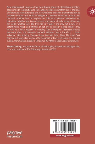 New philosophical essays on love by a diverse group of international scholars. Topics include contributions to the ongoing debate on whether love is arational or if there are reasons for love, and if so what kind; the kinds of love there may be (between humans and artificial intelligences, between non-human animals and humans); whether love can explain the difference between nationalism and patriotism; whether love is an necessary component of truly seeing others and the world; whether love, like free will, is "fragile," and may not survive in a deterministic world; and whether or not love is actually a good thing or may instead be a force opposed to morality. Key philosophers discussed include Immanuel Kant, Iris Murdoch, Bernard Williams, Harry Frankfurt, J. David Velleman, Niko Kolodny, Thomas Hurka, Bennett Helm, Alfred Mele and Derk Pereboom. Essays also touch on the treatment of love in literature and popular culture, from Graham Greene's The End of theAffair to Spike Jonze's movie her.