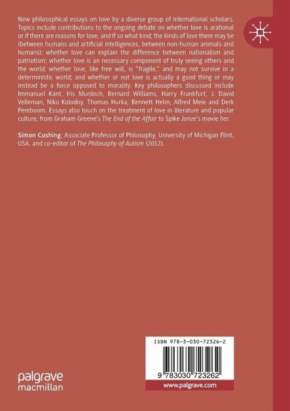 New philosophical essays on love by a diverse group of international scholars. Topics include contributions to the ongoing debate on whether love is arational or if there are reasons for love, and if so what kind; the kinds of love there may be (between humans and artificial intelligences, between non-human animals and humans); whether love can explain the difference between nationalism and patriotism; whether love is an necessary component of truly seeing others and the world; whether love, like free will, is "fragile," and may not survive in a deterministic world; and whether or not love is actually a good thing or may instead be a force opposed to morality. Key philosophers discussed include Immanuel Kant, Iris Murdoch, Bernard Williams, Harry Frankfurt, J. David Velleman, Niko Kolodny, Thomas Hurka, Bennett Helm, Alfred Mele and Derk Pereboom. Essays also touch on the treatment of love in literature and popular culture, from Graham Greene's The End of theAffair to Spike Jonze's movie her.