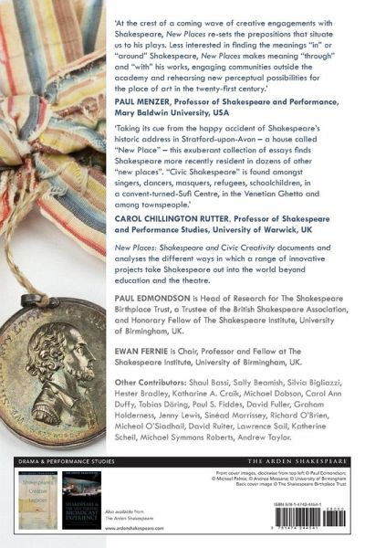 New Places: Shakespeare and Civic Creativity documents and analyses the different ways in which a range of innovative projects take Shakespeare out into the world beyond education and the theatre. Mixing critical reflection on the social value of Shakespeare with new creative work in different forms and idioms, the volume triumphantly shows that Shakespeare can make a real contribution to contemporary civic life. Highlights include: Garrick's 1769 Shakespeare ode, its revival in 2016, and a devised performance interpretation of it; the full text of Carol Ann Duffy's A Shakespeare Masque (set to music by Sally Beamish); a new Shakespearean libretto inspired by Wagner; an exploration of the civic potential of new Shakespeare opera and ballet; a fresh Shakespeare-inspired poetic liturgy, including commissions by major British poets; a production of The Merchant of Venice marking the 500th anniversary of the Venetian Jewish Ghetto; and a remaking of Pericles as a response to the global migrant crisis.