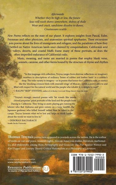 Afterwards Whether they be high or low, the future Seas will wash shores somewhere, shelves of shale Wear and crack, sandstone dissolve to dunes, Crustaceans scuttle . . . New Poems reflects on the state of our planet. It explores insights from Pascal, Euler, Feynman and other physicists, and anatomizes spiritual epiphanies. These excursions join poems about the lives of immigrants and refugees, and the paradoxes of how they settled on Native American lands once claimed by conquistadores. California's arid valleys, deserts, and coastal bluffs frame many of these portraits, as does the often-imperiled endurance of California's oaks. Music, meaning, and meter are married in poems that employ blank verse, sonnets, canzone, and other forms bound by the structure of rhyme and rhythm.