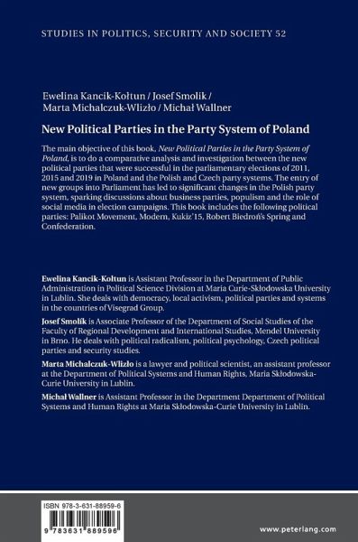 The main objective of this book - New Political Parties in the Party System of Poland is to analyse and investigate new political parties that were successful in the parliamentary elections of 2011, 2015 and 2019 in Poland, as well as to analyse the Polish and Czech party systems in a comparative manner. The entry of new groups into Parliament has led to significant changes in the Polish party system, sparking discussions about business parties, populism and the role of social media in election campaigns. The book includes the following political parties: Palikot Movement, Modern, Kukiz'15, Robert Biedron's Spring and Confederation.