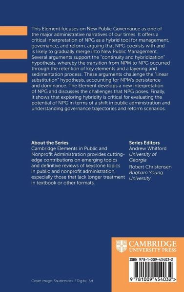 This Element focuses on New Public Governance as one of the major administrative narratives of our times. It offers a critical interpretation of NPG as a hybrid tool for management, governance, and reform, arguing that NPG coexists with and is likely to gradually merge into New Public Management. Several arguments support the 'continuity and hybridization' hypothesis, whereby the transition from NPM to NPG occurred through the retention of key elements and a layering and sedimentation process. These arguments challenge the "linear substitution" hypothesis, accounting for NPM's persistence and dominance. The Element develops a new interpretation of NPG and discusses the challenges that NPG poses. Finally, it shows that exploring hybridity is critical for evaluating the potential of NPG in terms of a shift in public administration and understanding governance trajectories and reform scenarios.
