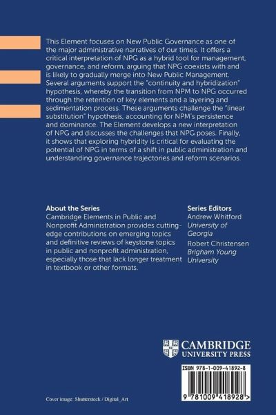 This Element focuses on New Public Governance as one of the major administrative narratives of our times. It develops a new interpretation of NPG, unveiling elements and reasons for continuity amidst change, and discusses the challenges that NPG, as a hybrid, poses.