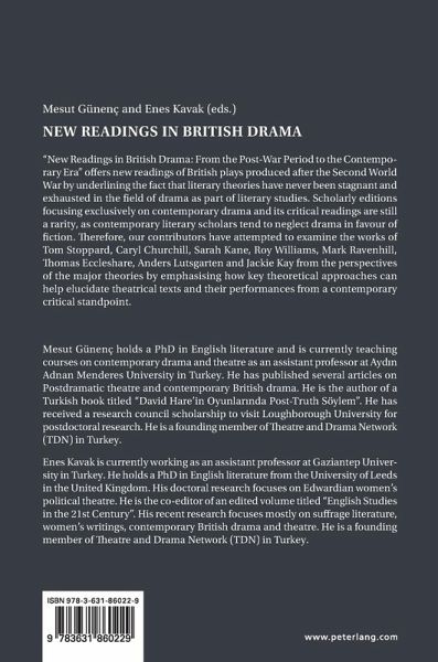 "New Readings in British Drama: From the Post-War Period to the Contemporary Era" offers new readings of British plays produced after the Second World War by underlining the fact that literary theories have never been stagnant and exhausted in the field of drama as part of literary studies. Scholarly editions focusing exclusively on contemporary drama and its critical readings are still a rarity, as contemporary literary scholars tend to neglect drama in favour of fiction. Therefore, our contributors have attempted to examine the works of Tom Stoppard, Caryl Churchill, Sarah Kane, Roy Williams, Mark Ravenhill, Thomas Eccleshare, Anders Lutsgarten and Jackie Kay from the perspectives of the major theories by emphasising how key theoretical approaches can help elucidate theatrical texts and their performances from a contemporary critical standpoint.