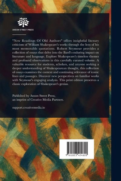 "New Readings Of Old Authors" offers insightful literary criticism of William Shakespeare's works through the lens of his most memorable quotations. Robert Seymour provides a collection of essays that delve into the Bard's enduring impact on literature and language. Explore Shakespeare's timeless themes and profound observations in this carefully curated volume. A valuable resource for students, scholars, and anyone seeking a deeper understanding of Shakespearean thought, this collection of essays examines the context and continuing relevance of iconic lines and passages. Discover new perspectives on familiar works with Seymour's engaging analysis. This print edition preserves a classic exploration of Shakespeare's genius. This work has been selected by scholars as being culturally important, and is part of the knowledge base of civilization as we know it. This work is in the public domain in the United States of America, and possibly other nations. Within the United States, you may freely copy and distribute this work, as no entity (individual or corporate) has a copyright on the body of the work. Scholars believe, and we concur, that this work is important enough to be preserved, reproduced, and made generally available to the public. We appreciate your support of the preservation process, and thank you for being an important part of keeping this knowledge alive and relevant.