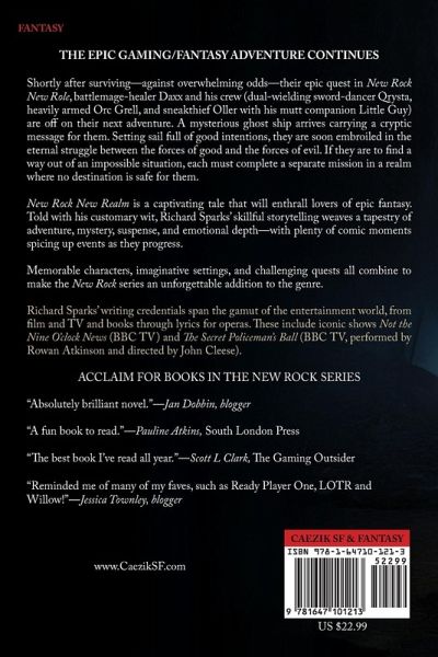 The Highly Anticipated Sequel to New Rock New RoleShortly after surviving-against overwhelming odds-their epic quest in New Rock New Role, battlemage Daxx and his crew (dual-wielding sword-dancer Qrysta, heavily-armed Orc Grell and sneakthief Oller, with his mutt companion Little Guy) are off on their next adventure. A mysterious ghost ship arrives, carrying a cryptic message for them. Setting sail full of good intentions, they are soon embroiled in the eternal struggle between the forces of good and the forces of evil. If they are to find a way out of an impossible situation, each must complete a separate mission in a realm where nowhere is safe for them. New Rock New Realm is a captivating tale that will enthrall lovers of epic fantasy. Told with his customary wit, Richard Sparks' skillful storytelling weaves a tapestry of adventure, mystery, suspense and emotional depth-with plenty of comic moments spicing up events as they progress. Memorable characters, imaginative settings and challenging quests all combine to make the New Rock series an unforgettable addition to the genre.