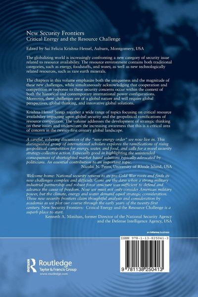 Introduction Global Security in the Twenty-first Century: The Critical Energy and Resource Challenges, Sai Felicia Krishna-Hensel; Chapter 1 Energy Security and the Revival of Geopolitics: The Russian Case, Mikhail A. Molchanov; Chapter 2 Energy Transitions and International Security in the Twenty-first Century, Mert Bilgin; Chapter 3 A Grounded Comparison of Energy Security in Denmark, Brazil, Bangladesh, and China, Benjamin K. Sovacool; Chapter 4 Global Energy Governance Post-2012: Bridging the Gap Between Energy Security and Climate Policy, Meraiah Foley; Chapter 5 An Economic and National Security Perspective on Critical Resources in the Energy Sector, Nayantara D. Hensel; Chapter 6 Hydropolitics in South American International Relations: A Perspective on Water Governance at the Prata Basin - Between Conflict and Cooperation (1960-1992), Fábio Albergaria de Queiroz; Chapter 7 A Need for New Institutions? Bilateral Deals over Food Producing Resources and International Co-Operation on Food Security, Benjamin Shepherd; Conclusion Conclusions Securing New Security Frontiers, Daniel S. Papp;