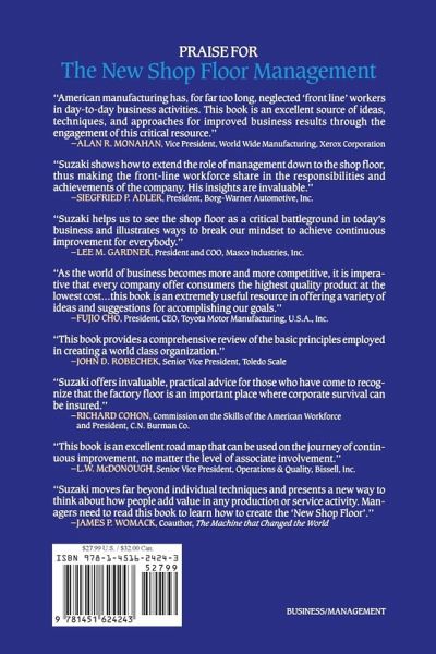 In this first comprehensive departure from the time-and-motion dictums of Frederick Taylor's Shop Management that have influenced management practices for most of this century, Kiyoshi Suzaki offers a framework for successfully conducting business at its most crucial point-the shop floor. Drawing on the principles of holistic management, where organizational boundaries are smashed and co-destiny is created, Suzaki demonstrates how modern shop floor management techniques -- focusing maximum energy on the front line -- can lead to dramatic improvements in productivity and valueadded-to-services. The role of management today, Suzaki argues, is to eliminate its own responsibilities by thinking of the organization from the genba, or shop floor, point of view. In this challenge, Suzaki claims, organizations need to collect the wisdom of people by practicing "Glass Wall Management," where organizations become transparent, enabling employees to contribute maximum creativity as opposed to blocking their potential with what he calls "Brick Wall Management." Further, to empower individuals to selfmanage their work and satisfy their customers, Suzaki asserts that they all should learn to manage their own "mini-company," where everybody is considered president of his or her area of responsibility. Front-line supervisors, Suzaki shows, must develop a mission and goals and share them both up and downstream. He cites examples of the "shop floor point of view" -- McDonald's Corporation's legal staff learning how to sell hamburgers and fix milkshake machines; Honda's human resource staff training on the assembly line -- that narrow the gap between top management and the shop floor. By upgrading people's skills, focusing on empowerment, and streamlining processes, Suzaki illustrates that an organization will realize concrete improvements in quality, cost, delivery, safety, morale, and ultimately, its competitive position.