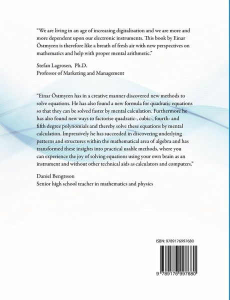 In this book I present a unique formula for quadratic equations, which is a rewriting of the p-q-formula. This rewriting resulted in the equations being solved almost twice as fast by the new formula, when it was compared in a test with the p-q-formula. Another test also showed that the new formula was much faster than the Vedic formula. The new formula is unique because the equations in the test were solved by mere mental calculation, which improves the memory and increases mental agility and intelligence.When I discovered that the middle coefficient in a quadratic equation contains all information about its origin, it led to a rule, that simplified the solving of of all equations. In a quadratic equation the origin could be located, and then it became possible to create a rule how the coefficients were to be split up into factors. By means of this rule and some exercises the answer to an equation can be both calculated and checked regardless of how large the coefficients are.This universal method is intended to be used before the equation is solved by a formula. Since the origin of a quadratic equation could be located, it was also simple to find the origin to other types of equations, and therefore new methods could be created. This led to the fact that a cubic equation could be solved without taking detours like polynomial division, a guess or a test of a root. When the origin of an equation can be located it is as easy to solve a fifth degree equation as a quadratic equation, in the same simple way as unlocking a safe with a key. The purpose of the book is mainly to make it as simple as possible for the students to solve equations, but also to give them a good insight into the origin of an equation.