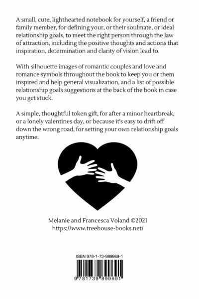 A small, cute, lighthearted notebook for yourself, a friend or family member, for defining your, or their soulmate, or ideal relationship goals, to meet the right person through the law of attraction, including the positive thoughts and actions that inspiration, determination and clarity of vision lead to. With silhouette images of romantic couples and love and romance symbols throughout the book to keep you or them inspired and help general visualization, and a list of possible relationship goals suggestions at the back of the book in case you get stuck. For the ease of the authors, the book is designed for straight women, but anyone can use it if they think it would be right for them.