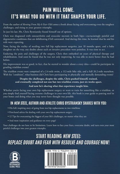 PAIN WILL COME. IT'S WHAT YOU DO WITH IT THAT SHAPES YOUR LIFE. From the author of "Renting From My 6-Year-Old" comes a book about facing and overcoming even the toughest challenges, and rising to your greatest triumphs. In just his late 30s, Chris Bystriansky found himself out of options. Chris was diagnosed with osteoarthritis and avascular necrosis in both hips-excruciatingly painful and degenerative conditions that are debilitating if left untreated. And during this time, he learned that he and his wife were expecting. Now, facing the reality of needing two full hip replacement surgeries, just 18 months apart, and a baby daughter on the way, any doubts about such an invasive procedure were pointless. It was time to act. Enduring the pain and challenges of the surgery, Chris then embarked on years of physical therapy and rehabilitation. And soon he found that he was not only improving, he was able to move better than he had before. His improvement was so good, in fact, that he started to wonder about a crazy idea-could he participate in grueling triathlon events? The triathlon events were comprised of a 2.4-mile swim, a 112-mile bike ride, and a full 26.2-mile marathon. With his "condition", what business did Chris have participating in physically and mentally demanding events? Despite the challenges, despite the odds, Chris pushed himself, trained, and eventually completed not one but two triathlon events, just six weeks apart. And now he's sharing what that experience taught him. Whether you're facing your own hip replacement surgery or want to train for something like a triathlon, or you simply find yourself facing extreme challenges in your own life, this book is your guide to putting steel in your bones and doing what you may never have thought was possible. IN NEW STEEL, AUTHOR AND ATHLETE CHRIS BYSTRIANSKY SHARES WITH YOU: - His full, inspiring story of going from two hip replacements to two triathlons - First-hand advice for dealing with your own hip replacement surgery - 12 Tips for overcoming the biggest of your life's challenges, no matter what they are - And more inspiration and guidance on every page! Your challenges do not have to be limitations. Learn how to face your fears, overcome doubt, and turn even your most painful challenges into your greatest triumphs. START READING NEW STEEL: REPLACE DOUBT AND FEAR WITH RESOLVE AND COURAGE NOW!