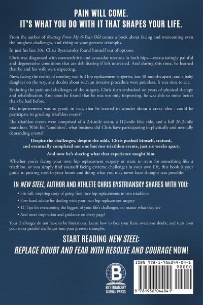 PAIN WILL COME. IT'S WHAT YOU DO WITH IT THAT SHAPES YOUR LIFE. From the author of "Renting From My 6-Year-Old" comes a book about facing and overcoming even the toughest challenges, and rising to your greatest triumphs. In just his late 30s, Chris Bystriansky found himself out of options. Chris was diagnosed with osteoarthritis and avascular necrosis in both hips-excruciatingly painful and degenerative conditions that are debilitating if left untreated. And during this time, he learned that he and his wife were expecting. Now, facing the reality of needing two full hip replacement surgeries, just 18 months apart, and a baby daughter on the way, any doubts about such an invasive procedure were pointless. It was time to act. Enduring the pain and challenges of the surgery, Chris then embarked on years of physical therapy and rehabilitation. And soon he found that he was not only improving, he was able to move better than he had before. His improvement was so good, in fact, that he started to wonder about a crazy idea-could he participate in grueling triathlon events? The triathlon events were comprised of a 2.4-mile swim, a 112-mile bike ride, and a full 26.2-mile marathon. With his "condition", what business did Chris have participating in physically and mentally demanding events? Despite the challenges, despite the odds, Chris pushed himself, trained, and eventually completed not one but two triathlon events, just six weeks apart. And now he's sharing what that experience taught him. Whether you're facing your own hip replacement surgery or want to train for something like a triathlon, or you simply find yourself facing extreme challenges in your own life, this book is your guide to putting steel in your bones and doing what you may never have thought was possible. IN NEW STEEL, AUTHOR AND ATHLETE CHRIS BYSTRIANSKY SHARES WITH YOU: - His full, inspiring story of going from two hip replacements to two triathlons - First-hand advice for dealing with your own hip replacement surgery - 12 Tips for overcoming the biggest of your life's challenges, no matter what they are - And more inspiration and guidance on every page! Your challenges do not have to be limitations. Learn how to face your fears, overcome doubt, and turn even your most painful challenges into your greatest triumphs. START READING NEW STEEL: REPLACE DOUBT AND FEAR WITH RESOLVE AND COURAGE NOW!