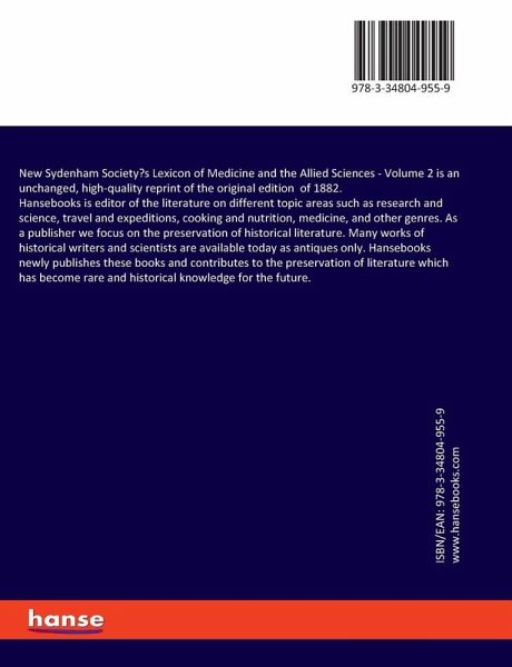 New Sydenham Society's Lexicon of Medicine and the Allied Sciences - Volume 2 is an unchanged, high-quality reprint of the original edition of 1882.Hansebooks is editor of the literature on different topic areas such as research and science, travel and expeditions, cooking and nutrition, medicine, and other genres. As a publisher we focus on the preservation of historical literature. Many works of historical writers and scientists are available today as antiques only. Hansebooks newly publishes these books and contributes to the preservation of literature which has become rare and historical knowledge for the future.