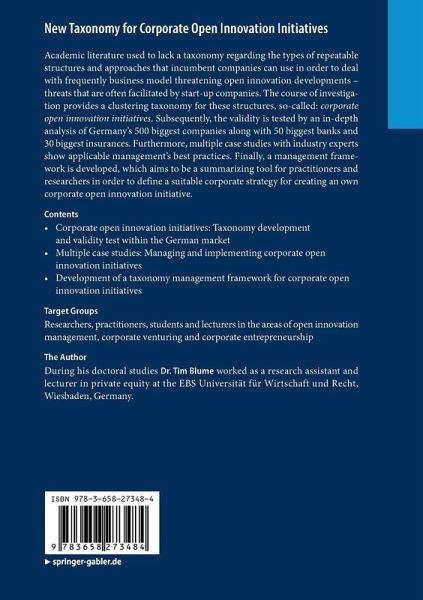 Academic literature used to lack a taxonomy regarding the types of repeatable structures and approaches that incumbent companies can use in order to deal with frequently business model threatening open innovation developments - threats that are often facilitated by start-up companies. The course of investigation provides a clustering taxonomy for these structures, so-called: corporate open innovation initiatives. Subsequently, the validity is tested by an in-depth analysis of Germany's 500 biggest companies along with 50 biggest banks and 30 biggest insurances. Furthermore, multiple case studies with industry experts show applicable management's best practices. Finally, a management framework is developed, which aims to be a summarizing tool for practitioners and researchers in order to define a suitable corporate strategy for creating an own corporate open innovation initiative.
