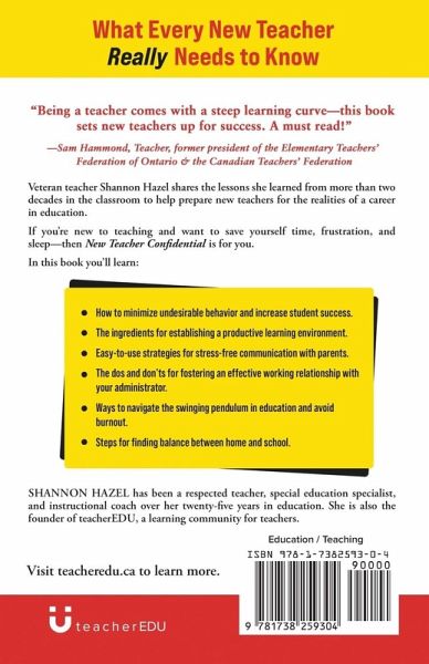 What Every New Teacher Really Needs to Know Veteran teacher Shannon Hazel shares the lessons she learned from more than two decades in the classroom to help prepare new teachers for the realities of a career in education. If you're new to teaching and want to save yourself time, frustration, and sleep-then New Teacher Confidential is for you. In this book you'll learn: · How genuine connections with students can be used to minimize undesirable behavior and increase student success. · The ingredients for establishing a productive learning environment. · Easy-to-use strategies for stress-free communication with parents. · The dos and don'ts for fostering an effective working relationship with your administrator. · Ways to navigate the swinging pendulum in education and avoid burnout. · Steps for finding balance between home and school. Shannon Hazel has been a respected teacher, special education specialist, and instructional coach over her twenty-five years in education. She is also the founder of teacherEDU, a learning community for teachers. Visit teacheredu.ca to learn more.