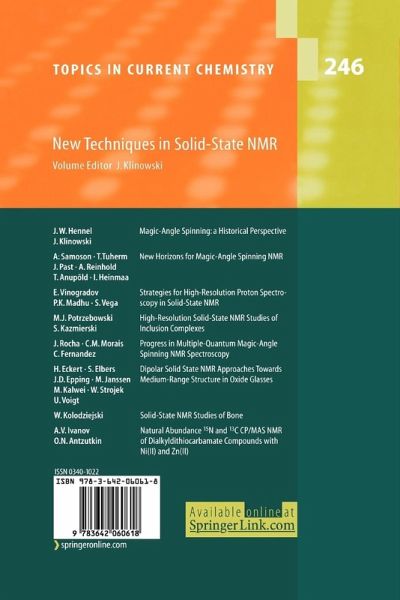 J. W. Hennel, J. Klinowski: Magic-Angle Spinning: a Historical Perspective.- A. Samoson, T.Tuherm, J. Past, A. Reinhold, T. Anupold, I. Heinmaa: New Horizons for Magic-Angle Spinning NMR.- E. Vinogradov, P.K. Madhu, S. Vega: Strategies for High-Resolution Proton Spectroscopy in the Solid-State NMR.- M.J. Potrzebowski, S. Kazmierski: High-Resolution Solid-State NMR Studies of Inclusion Complexes.- J. Rocha, C.M. Morais, C. Fernandez: Progress in Multiple-Quantum Magic-Angle Spinning NMR Spectroscopy.- H. Eckert, S. Elbers, J.D. Epping, M. Janssen, M. Kalwei, W. Strojek, U. Voigt: Dipolar Solid State NMR Approaches Towards Medium-Range Structure in Oxide Glasses.- W. Kolodziejski: Solid-State NMR Studies of Bone.- A.V. Ivanov, O.N. Antzutkin: Natural Abundance 15N and 13C CP/MAS NMR on Dialkyldithiocarbamate Compounds with Ni(II) and Zn(II)