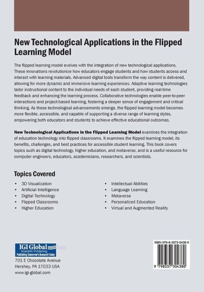 The flipped learning model evolves with the integration of new technological applications. These innovations revolutionize how educators engage students and how students access and interact with learning materials. Advanced digital tools transform the way content is delivered, allowing for more dynamic and immersive learning experiences. Adaptive learning technologies tailor instructional content to the individual needs of each student, providing real-time feedback and enhancing the learning process. Collaborative technologies enable peer-to-peer interactions and project-based learning, fostering a deeper sense of engagement and critical thinking. As these technological advancements emerge, the flipped learning model becomes more flexible, accessible, and capable of supporting a diverse range of learning styles, empowering both educators and students to achieve effective educational outcomes. New Technological Applications in the Flipped Learning Model examines the integration of education technology into flipped classrooms. It examines the flipped learning model, its benefits, challenges, and best practices for accessible student learning. This book covers topics such as digital technology, higher education, and metaverse, and is a useful resource for computer engineers, educators, academicians, researchers, and scientists.
