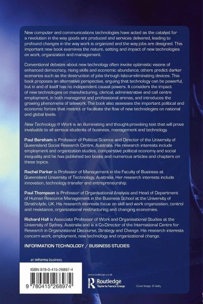 New computer and communications technologies have acted as the catalyst for a revolution in the way goods are produced and services delivered, leading to profound changes in the way work is organized and the way jobs are designed. This important book examines the nature, setting and impact of new technologies on work, organization and management. Conventional debates about new technology often invoke optimistic visions of enhanced democracy, rising skills and economic abundance; others predict darker scenarios such as the destruction of jobs through labour-eliminating devices. This book proposes an alternative perspective, arguing that technology can be powerful, but in and of itself has no independent causal powers. It considers the impact of new technologies on manufacturing, clerical, administrative and call centre employment, in both managerial and professional arenas, and introduces the growing phenomena of telework. The book also assesses the important political and economic forces that restrict or facilitate the flow of new technologies on national and global levels. New Technology @ Work is an illuminating and thought-provoking text that will prove invaluable to all serious students of business, management and technology.