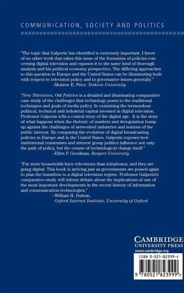 List of figures and tables; Preface and acknowledgements; List of acronyms and abbreviations; Part I. A Political Economy of Digital TV: 1. Introduction; 2. Why digital TV?; Part II. The American Road to Digital TV: 3. The genesis of broadcast regulation in the United States; 4. HDTV comes to America; 5. A new bargain; 6. A long journey; Part III. The British Road to Digital TV: 7. The European context; 8. The birth and evolution of analog TV in the United Kingdom; 9. Being first: the Digital TV race; 10. Murdoch-phobia?; 11. Digital TV and the New Labour; Part IV. New Television, Old Politics: 12. One goal, many paths; 13. Explaining national variations in digital TV policies; 14. Conclusion: the regulation of digital communications and the resilience of national regimes; References; Index.