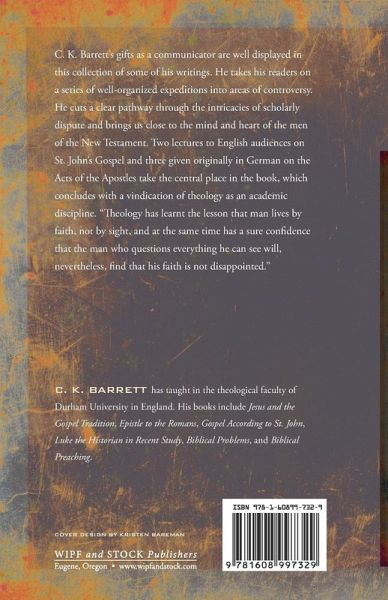 C. K. Barrett's gifts as a communicator are well displayed in this collection of some of his writings. He takes his readers on a series of well-organized expeditions into areas of controversy. He cuts a clear pathway through the intricacies of scholarly dispute and brings us close to the mind and heart of the men of the New Testament. Two lectures to English audiences on St. John's Gospel and three given originally in German on the Acts of the Apostles take the central place in the book, which concludes with a vindication of theology as an academic discipline. "Theology has learnt the lesson that man lives by faith, not by sight, and at the same time has a sure confidence that the man who questions everything he can see will, nevertheless, find that his faith is not disappointed."