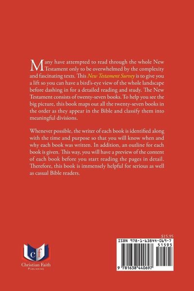 Many have attempted to read through the whole New Testament only to be overwhelmed by the complexity and fascinating texts. This New Testament Survey is to give you a lift so you can have a bird's-eye view of the whole landscape before dashing in for a detailed reading and study. The New Testament consists of twenty-seven books. To help you see the big picture, this book maps out all the twenty-seven books in the order as they appear in the Bible and classify them into meaningful divisions. Whenever possible, the writer of each book is identified along with the time and purpose so that you will know when and why each book was written. In addition, an outline for each book is given. This way, you will have a preview of the content of each book before you start reading the pages in detail. Therefore, this book is immensely helpful for serious as well as casual Bible readers.
