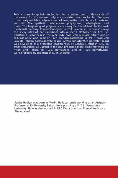 Polymers are long-chain molecules that contain tens of thousands of monomers. For this reason, polymers are called macromolecules. Examples of naturally available polymers are cellulose, cotton, starch, wool, proteins, and silk. The synthetic polymers are polystyrene, polyethylene, and nylon. The beginning of polymer science may be traced back to the mid-nineteenth century. Charles Goodyear in 1830 succeeded in transforming the sticky latex of natural rubber into a useful elastomer for tire use. Christian F. Schonbein in the year 1847 produced cellulose nitrate out of cellulose-nitric acid…mehr