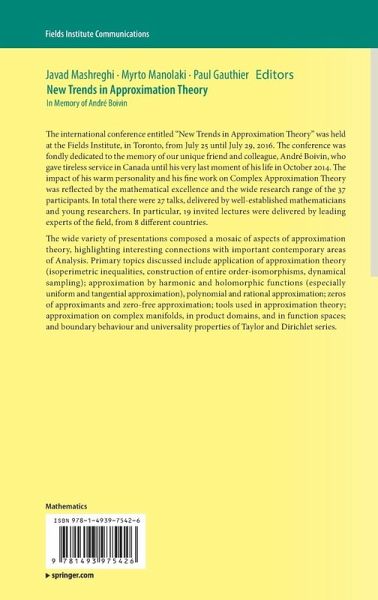 The international conference entitled "New Trends in Approximation Theory" was held at the Fields Institute, in Toronto, from July 25 until July 29, 2016. The conference was fondly dedicated to the memory of our unique friend and colleague, André Boivin, who gave tireless service in Canada until his very last moment of his life in October 2014. The impact of his warm personality and his fine work on Complex Approximation Theory was reflected by the mathematical excellence and the wide research range of the 37 participants. In total there were 27 talks, delivered by well-established…mehr