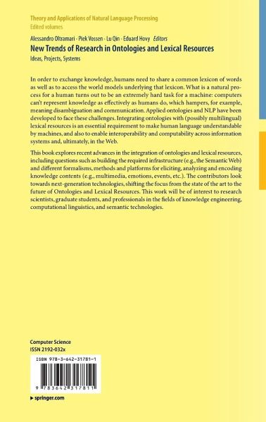This book explores recent advances in the integration of ontologies and lexical resources, including questions such as building the required infrastructure (e.g., the Semantic Web) and different formalisms, methods and platforms for eliciting, analyzing and encoding knowledge contents (e.g., multimedia, emotions, events, etc.). The contributors look towards next-generation technologies, shifting the focus from the state of the art to the future of Ontologies and Lexical Resources. This work will be of interest to research scientists, graduate students, and professionals in the fields of knowledge engineering, computational linguistics, and semantic technologies.
