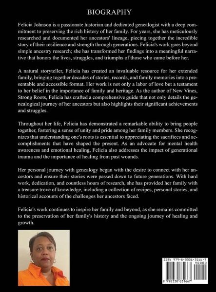 Felicia Johnson is a passionate historian and dedicated genealogist with a deep commitment to preserving the rich history of her family. For years, she has meticulously researched and documented her ancestors' lineage, piecing together the incredible story of their resilience and strength through generations. Felicia's work goes beyond simple ancestry research; she has transformed her findings into a meaningful narra- tive that honors the lives, struggles, and triumphs of those who came before her. A natural storyteller, Felicia has created an invaluable resource for her extended family, bringing together decades of stories, records, and family memories into a presentable and accessible format. Her work is not only a labor of love but a testament to her belief in the importance of family and heritage. As the author of New Vines, Strong Roots, Felicia has crafted a comprehensive guide that not only details the ge- nealogical journey of her ancestors but also highlights their significant achievements and struggles.
