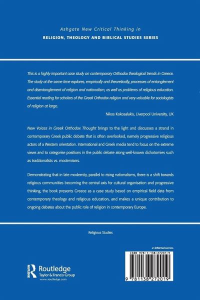 New Voices in Greek Orthodox Thought brings to the light and discusses a strand in contemporary Greek public debate that is often overlooked, namely progressive religious actors of a western orientation. International - and Greek - media tend to focus on the extreme views and to categorise positions in the public debate along well known dichotomies such as traditionalists vs. modernsers. Demonstrating that in late modernity, parallel to rising nationalisms, there is a shift towards religious communities becoming the central axis for cultural organization and progressive thinking, the book presents Greece as a case study based on empirical field data from contemporary theology and religious education, and makes a unique contribution to ongoing debates about the public role of religion in contemporary Europe.