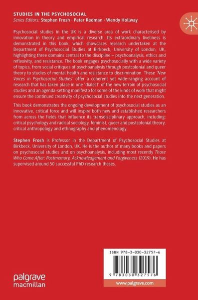 Psychosocial studies in the UK is a diverse area of work characterised by innovation in theory and empirical research. Its extraordinary liveliness is demonstrated in this book, which showcases research undertaken at the Department of Psychosocial Studies at Birkbeck, University of London, UK, highlighting three domains central to the discipline - psychoanalysis, ethics and reflexivity, and resistance. The book engages psychosocially with a wide variety of topics, from social critiques of psychoanalysis through postcolonial and queer theory to studies of mental health and resistance to discrimination. These 'New Voices in Psychosocial Studies' offer a coherent yet wide-ranging account of research that has taken place in one 'dialect' of the new terrain of psychosocial studies and an agenda-setting manifesto for some of the kinds of work that might ensure the continued creativity of psychosocial studies into the next generation.