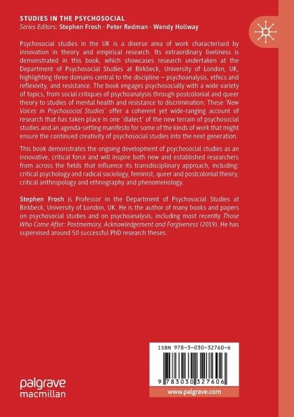 Psychosocial studies in the UK is a diverse area of work characterised by innovation in theory and empirical research. Its extraordinary liveliness is demonstrated in this book, which showcases research undertaken at the Department of Psychosocial Studies at Birkbeck, University of London, UK, highlighting three domains central to the discipline - psychoanalysis, ethics and reflexivity, and resistance. The book engages psychosocially with a wide variety of topics, from social critiques of psychoanalysis through postcolonial and queer theory to studies of mental health and resistance to discrimination. These 'New Voices in Psychosocial Studies' offer a coherent yet wide-ranging account of research that has taken place in one 'dialect' of the new terrain of psychosocial studies and an agenda-setting manifesto for some of the kinds of work that might ensure the continued creativity of psychosocial studies into the next generation.