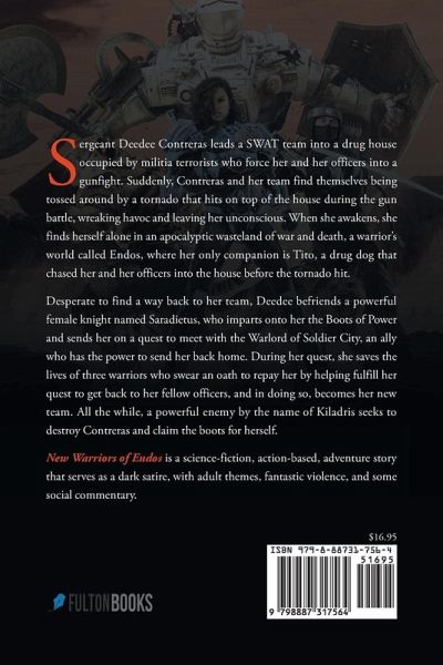 Sergeant Deedee Contreras leads a SWAT team into a drug house occupied by militia terrorists who force her and her officers into a gunfight. Suddenly, Contreras and her team find themselves being tossed around by a tornado that hits on top of the house during the gun battle, wreaking havoc and leaving her unconscious. When she awakens, she finds herself alone in an apocalyptic wasteland of war and death, a warrior's world called Endos, where her only companion is Tito, a drug dog that chased her and her officers into the house before the tornado hit. Desperate to find a way back to her team, Deedee befriends a powerful female knight named Saradietus, who imparts onto her the Boots of Power and sends her on a quest to meet with the Warlord of Soldier City, an ally who has the power to send her back home. During her quest, she saves the lives of three warriors who swear an oath to repay her by helping fulfill her quest to get back to her fellow officers, and in doing so, becomes her new team. All the while, a powerful enemy by the name of Kiladris seeks to destroy Contreras and claim the boots for herself. New Warriors of Endos is a science-fiction, action-based, adventure story that serves as a dark satire, with adult themes, fantastic violence, and some social commentary.