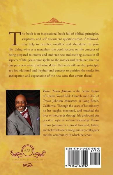 This book is an inspirational book full of biblical principles, scriptures, and self assessment questions that, if followed, may help to manifest overflow and abundance in your life. Using wine as a metaphor, the book focuses on the concept of being prepared to receive and embrace new and exciting success in all aspects of life. Jesus once spoke to the masses and explained that no one puts new wine in old wine skins. This work will use that principle as a foundational and inspirational concept to position the reader for anticipation and expectation of the new wine that awaits them!