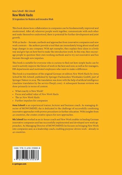 This book isa translation of the original German 1st edition New Work Hacks by & Anna Schnell & Nils Schnell, published by Springer Fachmedien Wiesbaden GmbH, part of Springer Nature in 2019. The translation was done with the help of artificial intelligence (machine translation by the service DeepL.com). A subsequent human revision was done primarily in terms of content.
