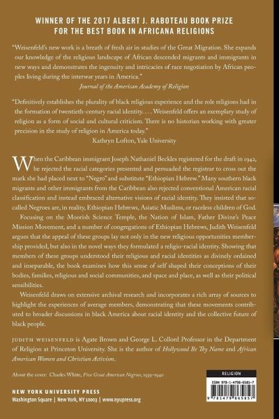 "When Joseph Nathaniel Beckles registered for the draft in the 1942, he rejected the racial categories presented to him and persuaded the registrar to cross out the check mark she had placed next to Negro and substitute "Ethiopian Hebrew." "God did not make us Negroes," declared religious leaders in black communities of the early twentieth-century urban North. They insisted that so-called Negroes are, in reality, Ethiopian Hebrews, Asiatic Muslims, or raceless children of God. Rejecting conventional American racial classification, many black southern migrants and immigrants from the Caribbean embraced these alternative visions of black history, racial identity, and collective future, thereby reshaping the black religious and racial landscape. Focusing on the Moorish Science Temple, the Nation of Islam, Father Divine's Peace Mission Movement, and a number of congregations of Ethiopian Hebrews, Judith Weisenfeld argues that the appeal of these groups lay not only in the new religious opportunities membership provided, but also in the novel ways they formulated a religio-racial identity. Arguing that members of these groups understood their religious and racial identities as divinely-ordained and inseparable, the book examines how this sense of self shaped their conceptions of their bodies, families, religious and social communities, space and place, and political sensibilities. Weisenfeld draws on extensive archival research and incorporates a rich array of sources to highlight the experiences of average members."--Publisher's description.