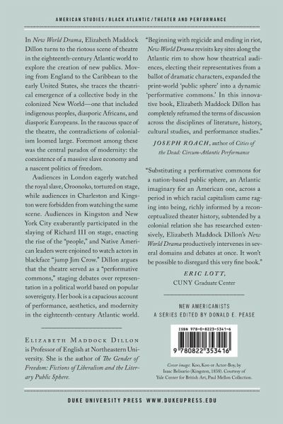 In New World Drama, Elizabeth Maddock Dillon turns to the riotous scene of theatre in the eighteenth-century Atlantic world to explore the creation of new publics. Moving from England to the Caribbean to the early United States, she traces the theatrical emergence of a collective body in the colonized New World-one that included indigenous peoples, diasporic Africans, and diasporic Europeans. In the raucous space of the theatre, the contradictions of colonialism loomed large. Foremost among these was the central paradox of modernity: the coexistence of a massive slave economy and a nascent politics of freedom. Audiences in London eagerly watched the royal slave, Oroonoko, tortured on stage, while audiences in Charleston and Kingston were forbidden from watching the same scene. Audiences in Kingston and New York City exuberantly participated in the slaying of Richard III on stage, enacting the rise of the "people," and Native American leaders were enjoined to watch actors in blackface "jump Jim Crow." Dillon argues that the theater served as a "performative commons," staging debates over representation in a political world based on popular sovereignty. Her book is a capacious account of performance, aesthetics, and modernity in the eighteenth-century Atlantic world.