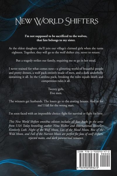 Now introducing the paperback omnibus, featuring all four books packaged in one stunning edition. Read the complete series now! I'm not supposed to be sacrificed to the wolves, that fate belongs to my sister. As the eldest daughter, she'll join our village's claimed girls when she turns eighteen. Together, they will go to the wolf shifter city, never to return. But a terrible tragedy strikes our family, requiring me to go in her stead. I never trained for what comes next-a glittering world of beautiful people and pretty dresses, a wolf pack entirely made of men, and a dark underbelly sustaining it all. In the Carolina pack, breaking the rules equals death and competition rules it all. Twenty girls. Five men. The winners get husbands. The losers go to the mating houses. And as for me? I fall for the wrong man. I'm soon faced with an impossible choice: fight for survival or fight for love. By USA Today bestselling author Nina Walker and International bestseller Kimberly Loth, the New World Shifters series is perfect for fans of shifters, rejected mates, and dark paranormal romance.